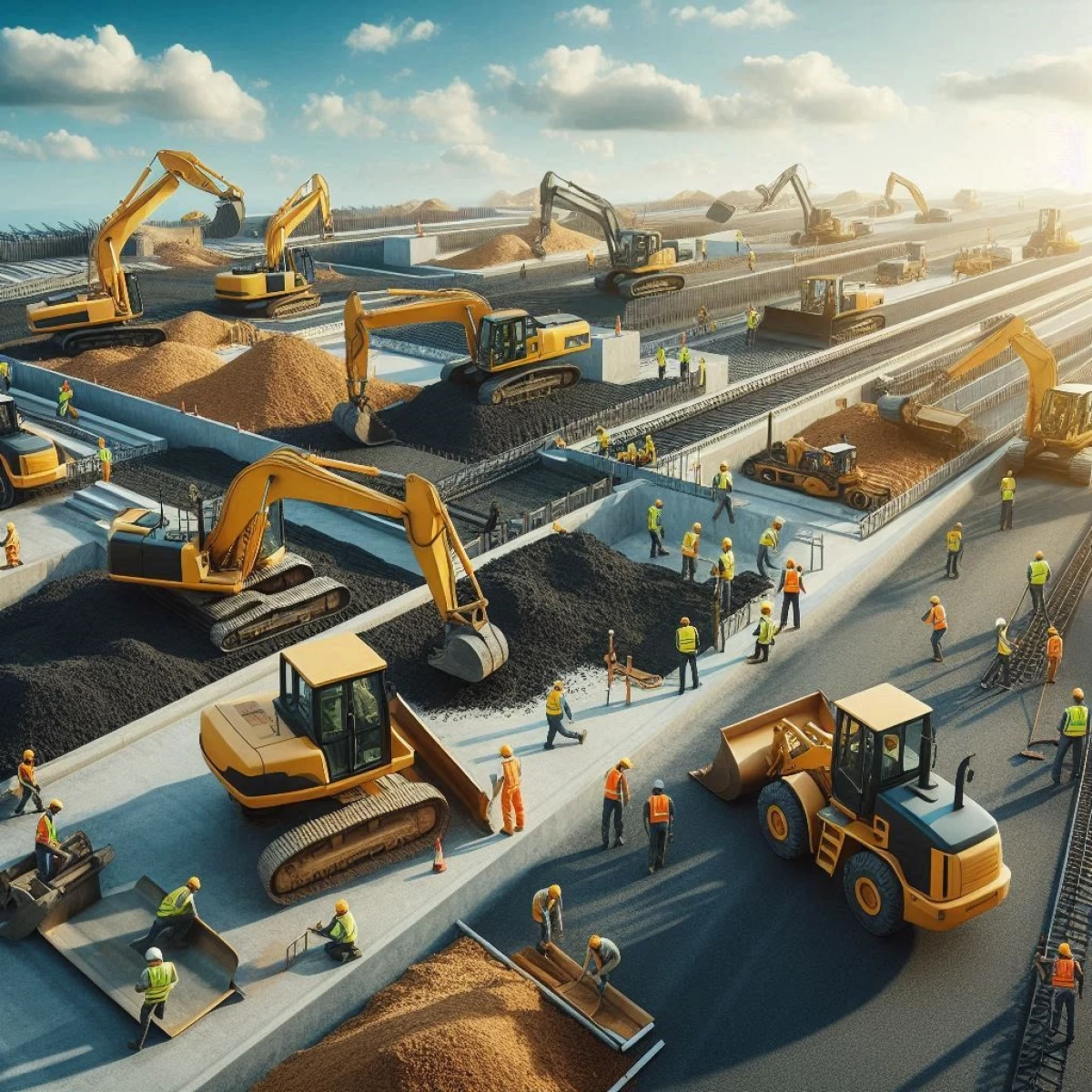 - Budowa nasypów, skarp i rowów odwadniających,